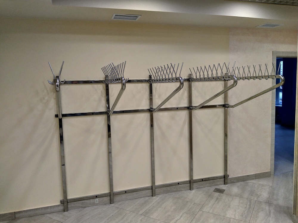 Гардеробное оборудование на 90 мест. Для экономии места направляющие с крючками подвижные. Цена ориентировочная без монтажа. Ссылка на видео https://youtu.be/5Vw-3yTzH24