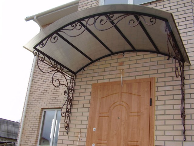 Кованый козырек – роскошен и презентабелен. Он может сталь элементом в дизайне экстерьера дома. Конечно, ковка – это дорого, но не обязательно изготавливать полностью кованый козырек. Присутствие в конструкции элементов ковки существенно преобразит внешний вид сооружения. Хорошо смотрится сочетание ковки с такими материалами, как поликарбонат, металлочерепица,