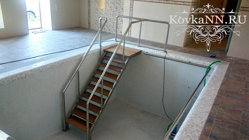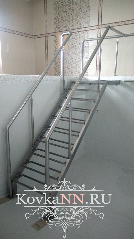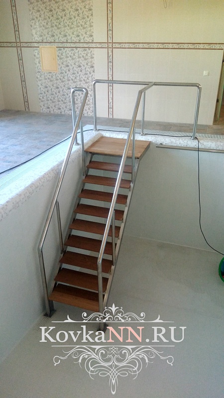 Лестница выполненна из нержавеющей стали, Косоур: профильная труба 80х40 мм. Покрытие на ступенях: дерево тик. Поручень: 50,8х1,5 мм Стойка 38 мм
