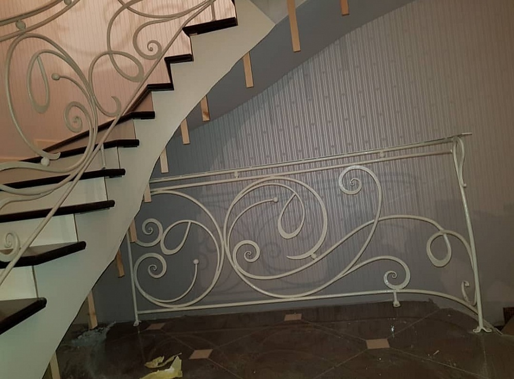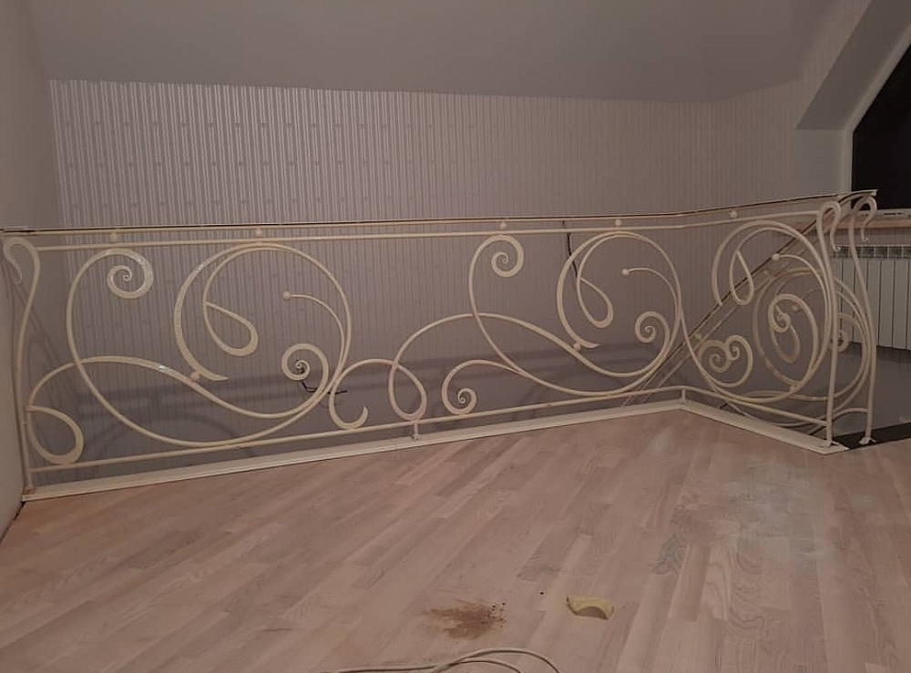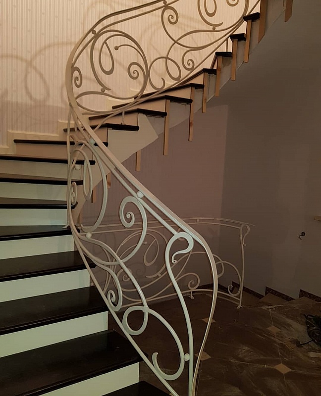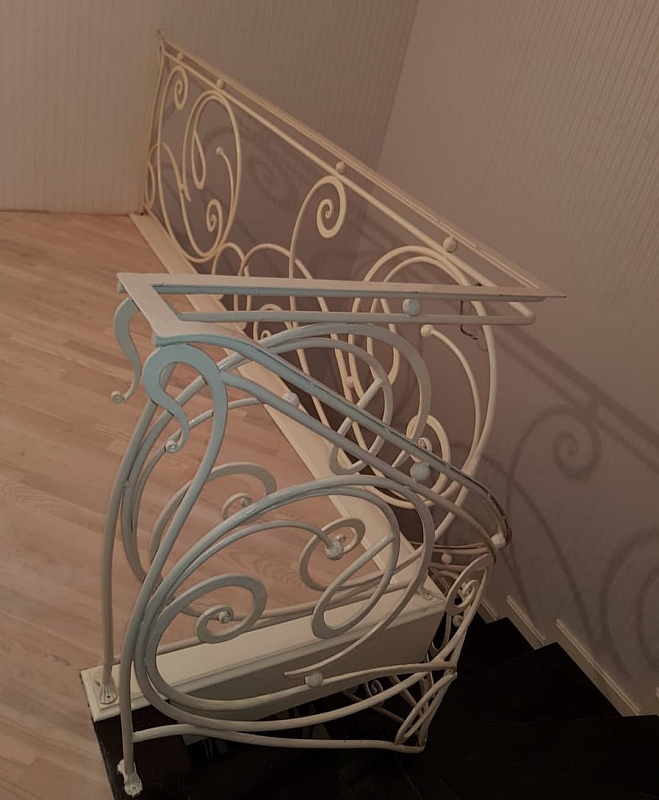 Очень элегантные кованные перила для лестницы. Эффектно выглядит как в белом цвете так и в других цветовых исполнениях.